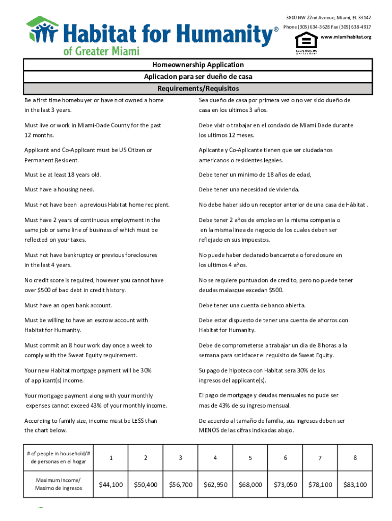 3800 NW 22nd Avenue, Miami, FL 33142 Phone (305) 6343628 Fax (305) 6384917 www.miamihabitat.orgHomeownership Application para SER due ode Casey Requirements/Requisites Be a first time homebuyer or