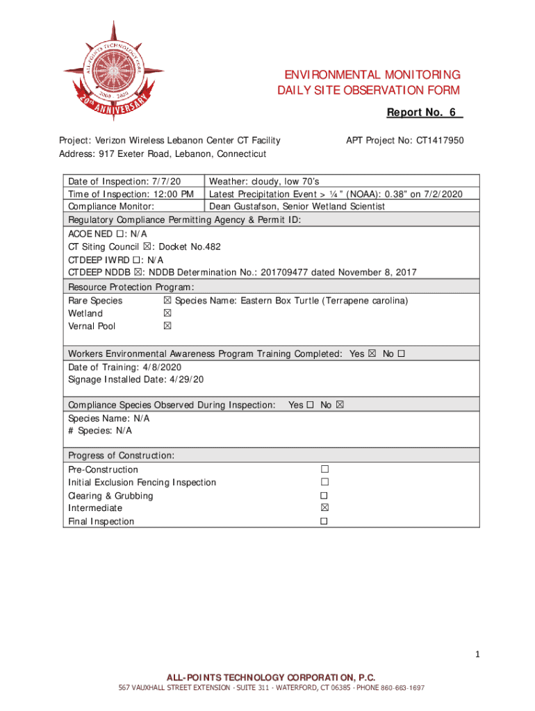 ENVIRONMENTAL MONITORING DAILY SITE OBSERVATION FORM Report No._6_ Project: Verizon Wireless Lebanon Center CT Facility Address: 917 Peter Road, Lebanon, Connecticut APT Project No: CT1417950Date