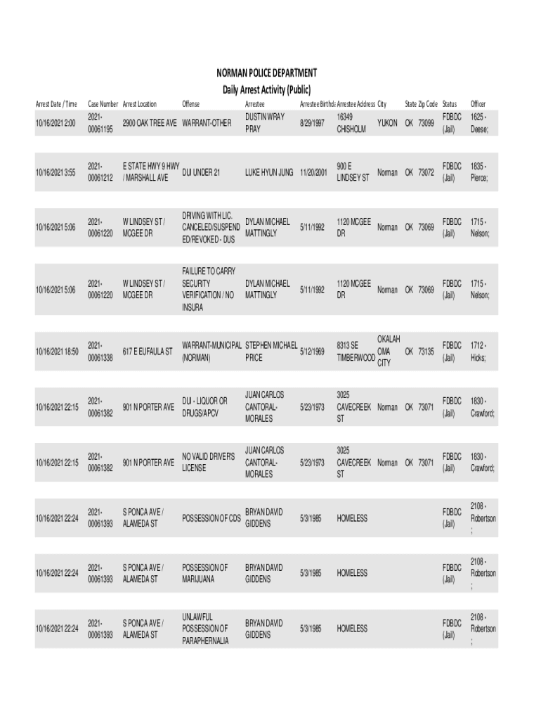NORMAN POLICE DEPARTMENT Daily Arrest Activity (Public) Arrest Date / Time Case Number Arrest Location Offense 20212900 OAK TREE AVE WARRANTOTHER 00061195Arrestee DUSTIN WAY PRAYArrestee BirthdayArrestee