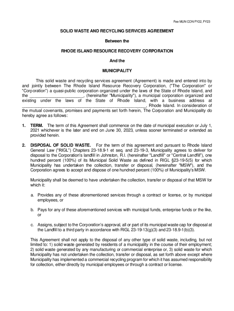 Fee MUN CON FY22, FY23SOLID WASTE AND RECYCLING SERVICES AGREEMENT Between the RHODE ISLAND RESOURCE RECOVERY CORPORATION And the MUNICIPALITY This solid waste and recycling services agreement (Agreement)