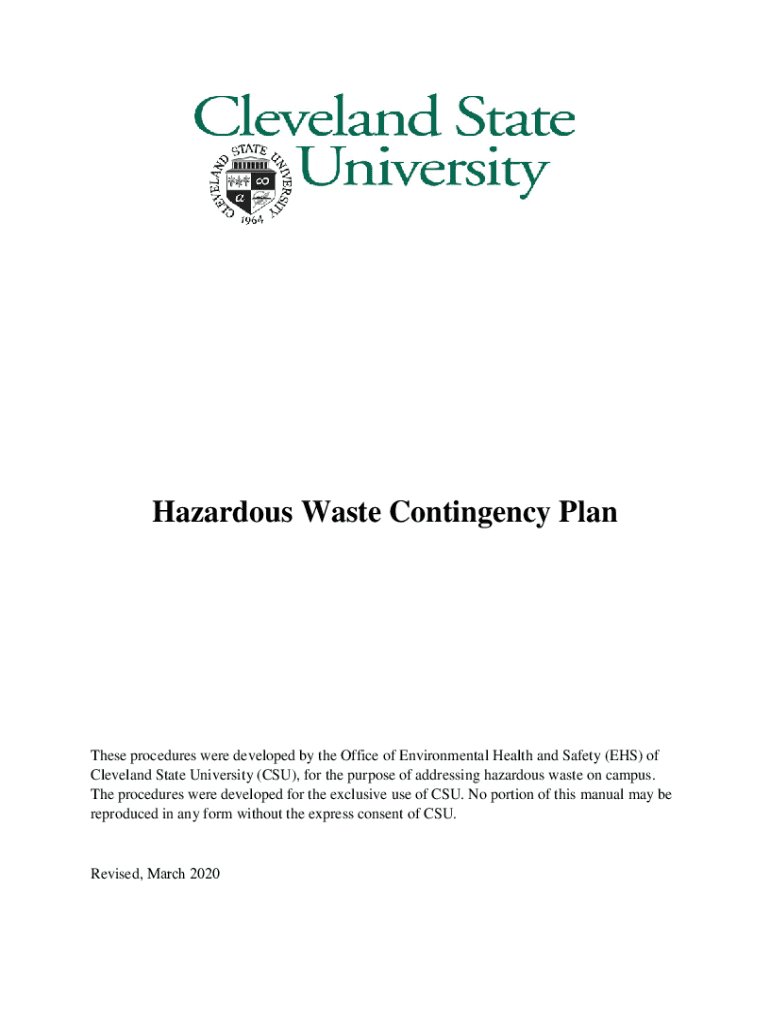 Hazardous Waste Contingency Plants procedures were developed by the Office of Environmental Health and Safety (EHS) of Cleveland State University (CSU), for the purpose of addressing hazardous waste