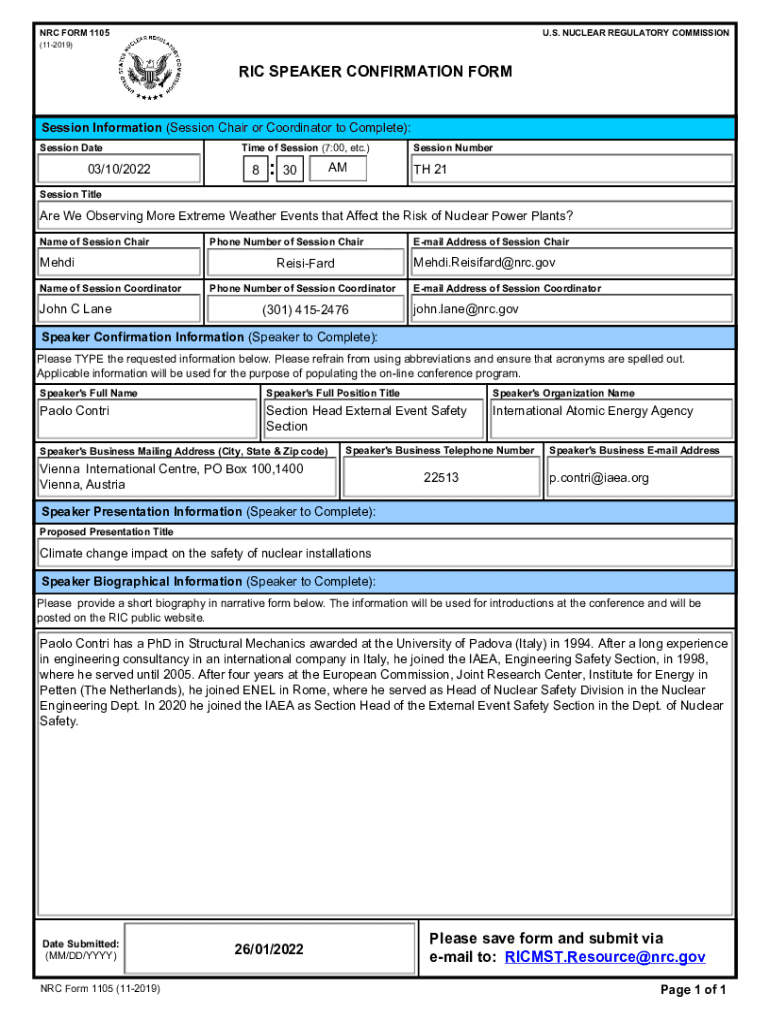 Get the free NRC FORM 1105 U.S. NUCLEAR REGULATORY COMMISSION (11-2019) RIC SPEAKER ...