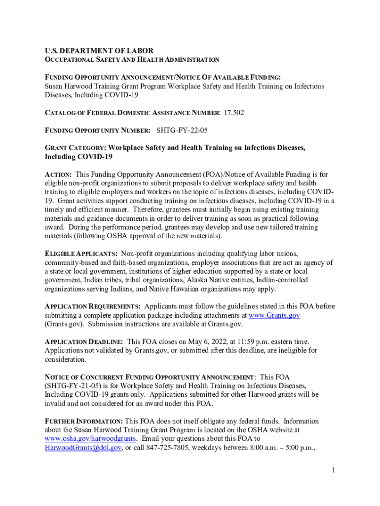 U.S. DEPARTMENT OF LABOR OCCUPATIONAL SAFETY AND HEALTH ADMINISTRATION FUNDING OPPORTUNITY ANNOUNCEMENT/NOTICE OF AVAILABLE FUNDING: Susan Hardwood Training Grant Program Workplace Safety and Health