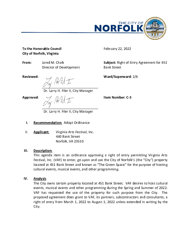 To the Honorable Council City of Norfolk, Virginia February 22, 2022From:Subject: Right of Entry Agreement for 451 Bank Street Jared M. Chalk Director of DevelopmentReviewed:Ward/Superward: 2/6Dr.