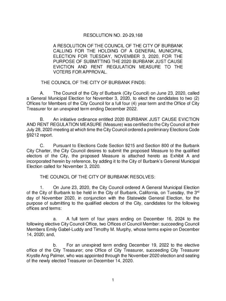 RESOLUTION NO. 2029,168 A RESOLUTION OF THE COUNCIL OF THE CITY OF BURBANK CALLING FOR THE HOLDING OF A GENERAL MUNICIPAL ELECTION FOR TUESDAY, NOVEMBER 3, 2020, FOR THE PURPOSE OF SUBMITTING THE