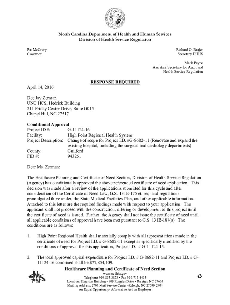 North Carolina Department of Health and Human Services Division of Health Service Regulation Pat McCrory Governor Richard O. Braver Secretary HHS Mark Payne Assistant Secretary for Audit and Health