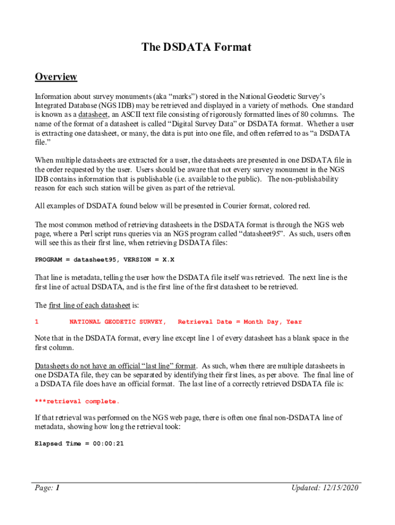 The DSD ATA Format Overview Information about survey monuments (aka marks) stored in the National Geodetic Surveys Integrated Database (NGS IDB) may be retrieved and displayed in a variety of methods.
