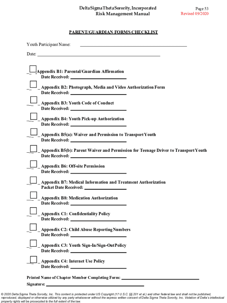Delta Sigma Theta Sorority, Incorporated Risk Management Manual Page 52 Revised 09/2020B. Parent/Guardian Forsythe forms contained herein have been approved by Delta Sigma Theta Sorority, Incorporated,