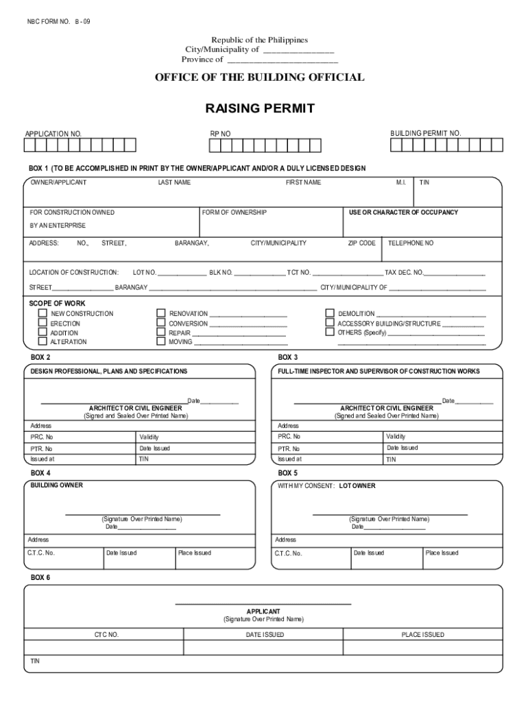 NBC FORM NO. B 09Republic of the Philippines City/Municipality of ___ Province of ___OFFICE OF THE BUILDING OFFICIALIZING PERMIT BUILDING PERMIT NO.RP APPLICATION NO.BOX 1 (TO BE ACCOMPLISHED IN PRINT