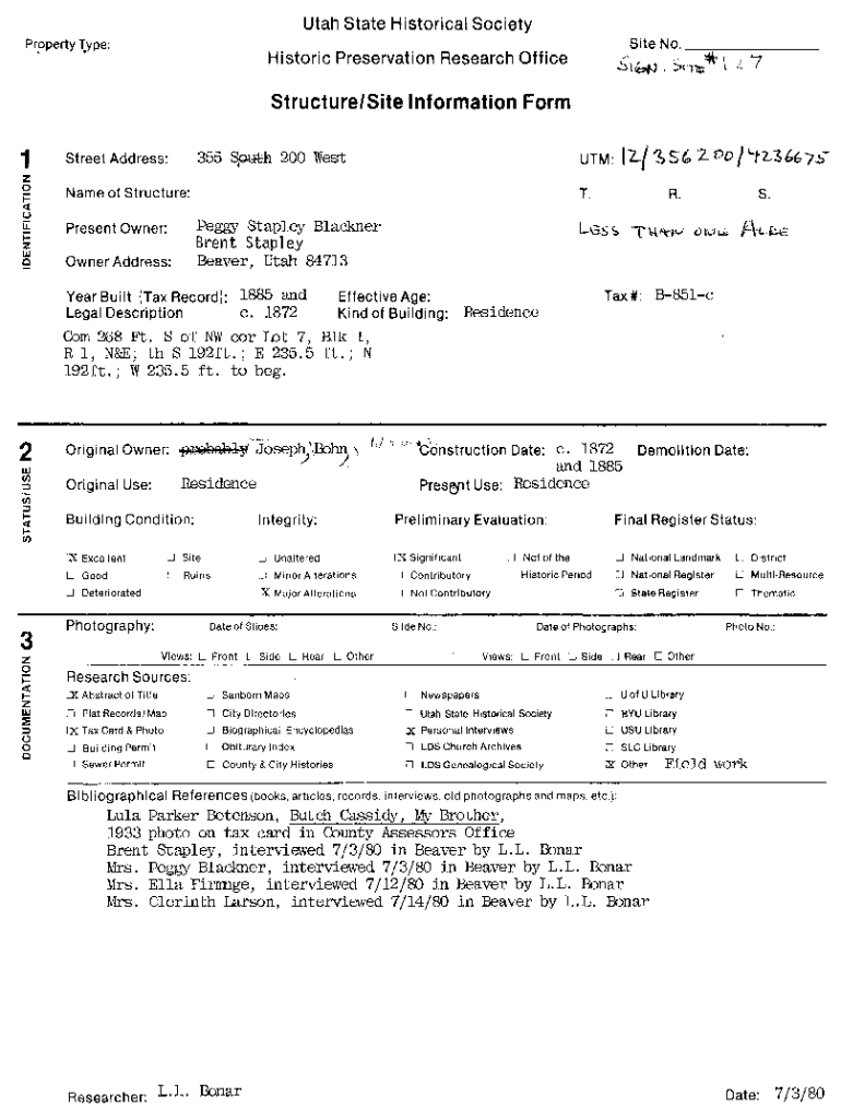 Utah State Historical Society Property Type:Site No. Historic Preservation Research OfficeSITSBStructure/Site Information Form1zoStreet Address:355 SPH 200 West:Name of Structure:present Owner: Owner