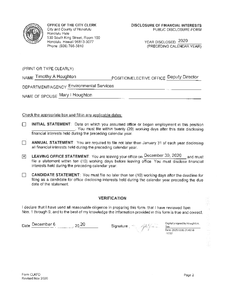 _________OFFICE OF THE CITY CLERK City and County of Honolulu Hale 530 South King Street, Room 100 Honolulu. Hawaii 968133077 Phone (808) 7683810DISCLOSURE OF FINANCIAL INTERESTSPUBLIC DISCLOSURE
