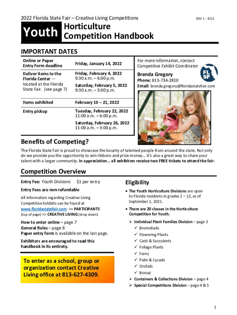 2022 Florida State Fair Creative Living CompetitionsYouthREV 1 8/11Horticulture Competition HandbookIMPORTANT DATES Online or Paper Entry Form deadline Friday, January 14, 2022For more information,