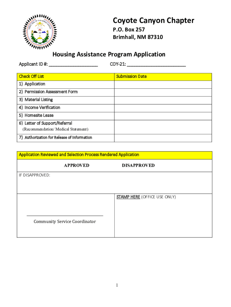 Coyote Canyon Chapter P.O. Box 257 Brim hall, NM 87310Housing Assistance Program Application Applicant ID #: ___ Check Off ListCOY21: ___ Submission Date1) Application 2) Permission Assessment Form