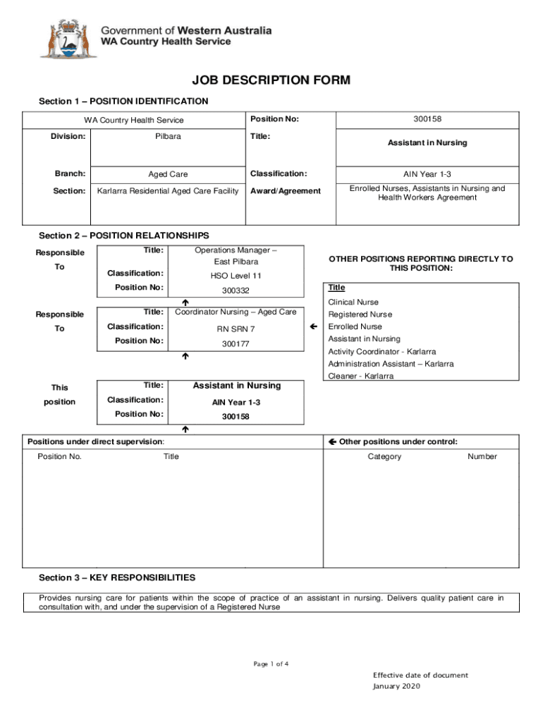 JOB DESCRIPTION FORM Section 1 POSITION IDENTIFICATION Position No:WA Country Health Service Division:PilbaraBranch:Aged Resection:Barbara Residential Aged Care Facility300158Title:Assistant in NursingClassification:AIN