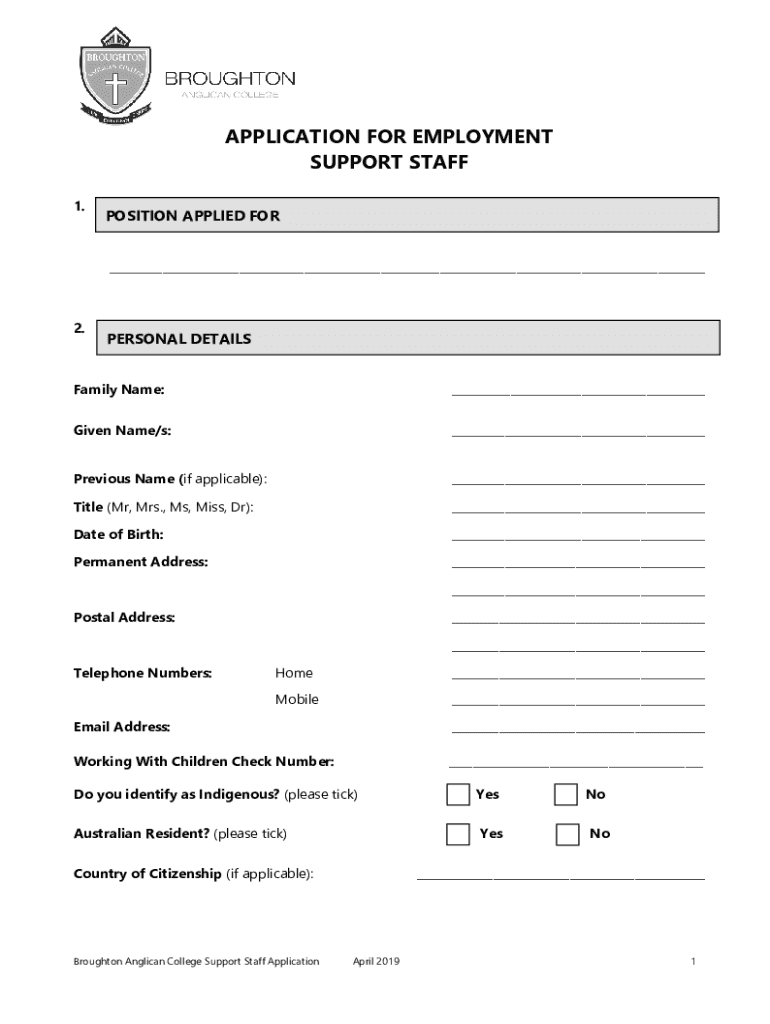 APPLICATION FOR EMPLOYMENT SUPPORT STAFF 1.POSITION APPLIED FOR ___2.PERSONAL DETAILSFamily Name:___Given Name/s:___Previous Name (if applicable):___Title (Mr, Mrs., Ms, Miss, Dr):___Date of Birth:___Permanent