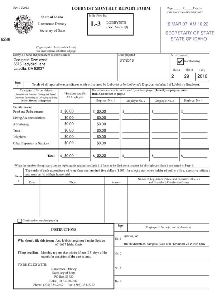 Rev. 12/2012LOBBYIST MONTHLY REPORT FORM To Be Filed By:State of Idaho Lawrence DenneyL3Secretary of StatePage___of___Page(s) THIS SPACE FOR OFFICE USE ONLYLOBBYISTS (Sec. 676619)16 MAR 07 AM 10:22