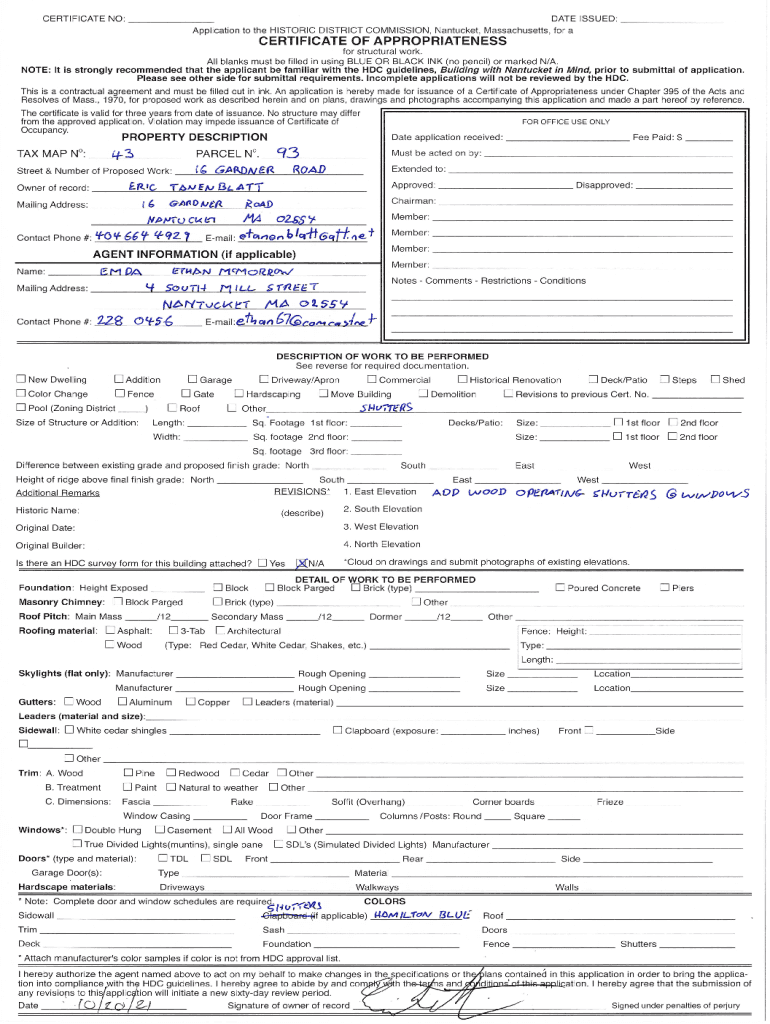 DATE ISSUED:CERTIFICATE NO:Application to the HISTORIC DIST]LCT COMMISSION, Nantucket, Massachusetts, for certificate OF APPROPRIATENESS for structural work. All blanks must be filled in using BLUE