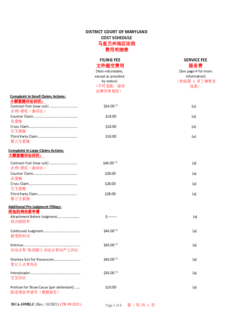 DISTRICT COURT OF MARYLAND COST SCHEDULE Complaint in Small Claims Actions: Contractor (new suit). Counter Claim. Cross Claim.................... Third Party Claim. FILING FEE SERVICE.
