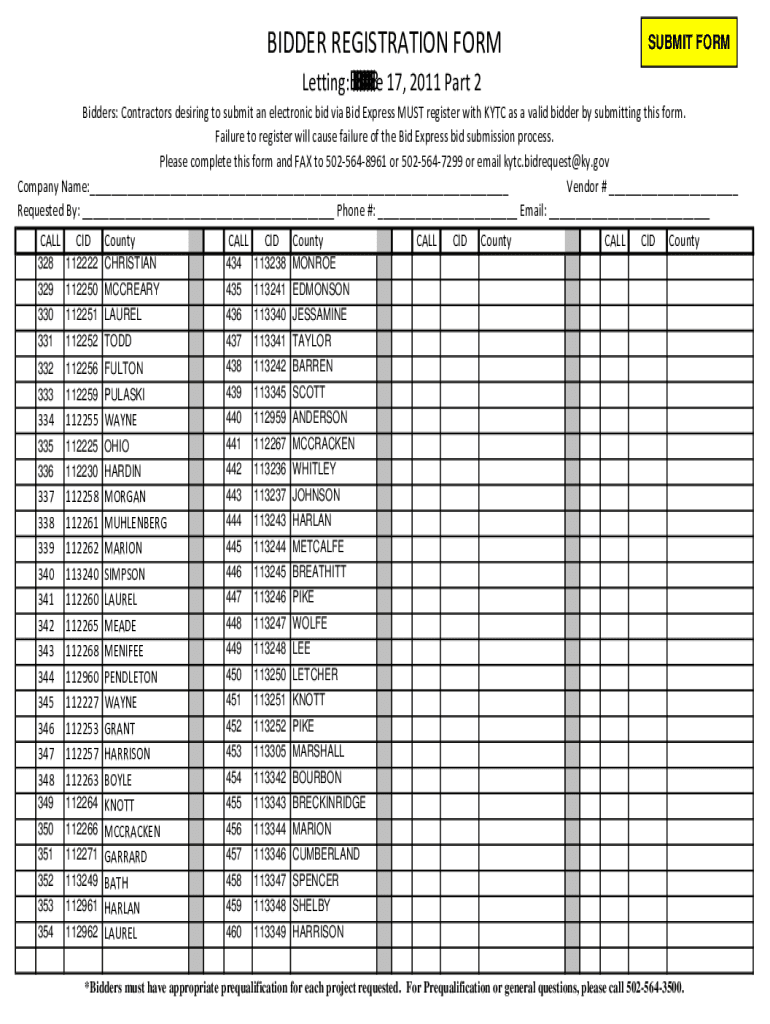 BIDDER REGISTRATION RESUBMIT Forgetting: June 17, 2011, Part 2 Bidders: Contractors desiring to submit an electronic bid via Bid Express MUST register with KYTI as a valid bidder by submitting this