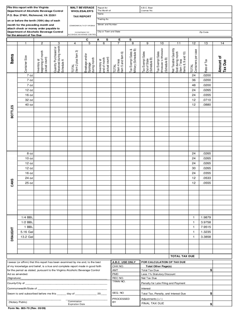 File this report with the Virginia Department of Alcoholic Beverage Controllable BEVERAGE WHOLESALER\'S TAX REPORTTrading Son or before the tenth (10th) day of each COMMONWEALTH OF VIRGINIADEPARTMENT