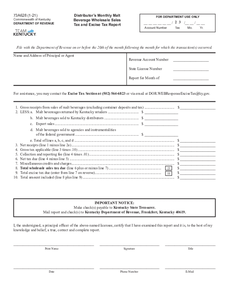 73A628 (121)Commonwealth of Kentucky DEPARTMENT OF REVENUEDistributors Monthly Malt Beverage Wholesale Sales Tax and Excise Tax Reporter DEPARTMENT USE ONLY__ __ __ __ __ __ / 2 3 /__ __ / __ __ Account