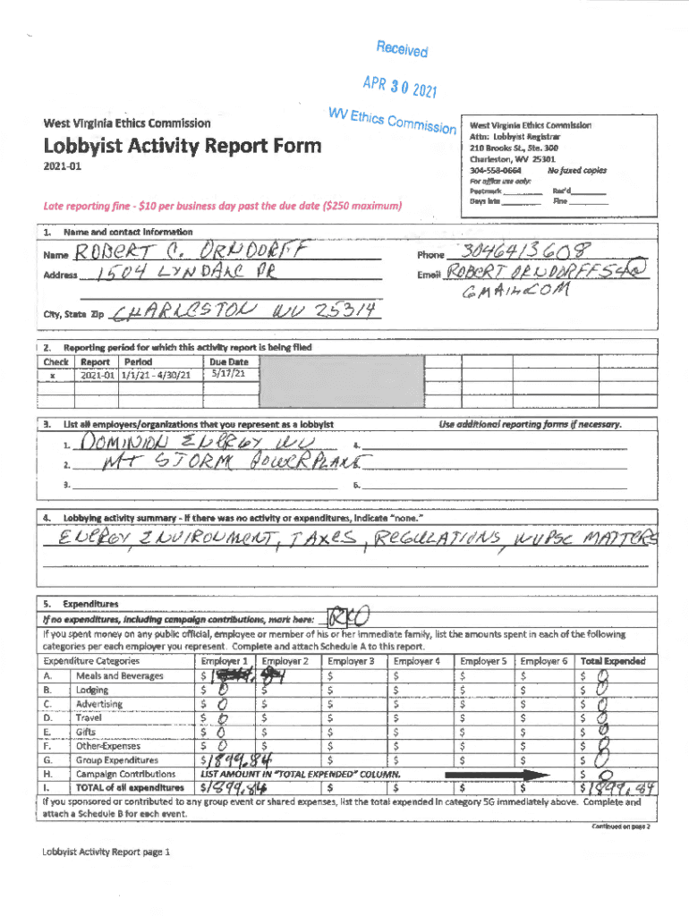 Received APR 3 0 2021WV Ethics Com West Virginia Ethics Commission. . Mission West Virginia Ethics Commission Attn: Lobbyist Registrar 210 Brooks St., Ste. 300 Charleston, WV 25301 No faxed copies