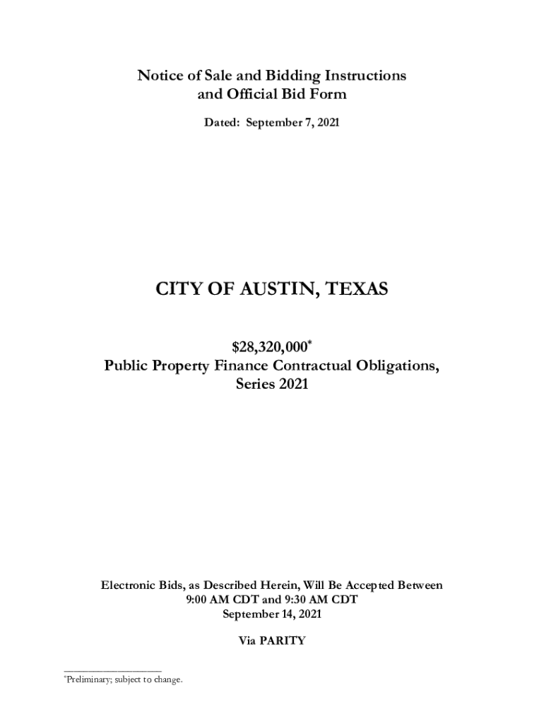 Notice of Sale and Bidding Instructions and Official Bid Form Dated: September 7, 2021CITY OF AUSTIN, TEXAS $28,320,000* Public Property Finance Contractual Obligations, Series 2021Electronic Bids,