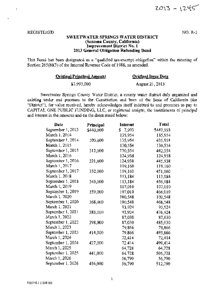 NO. R1REGISTERED SWEETWATER SPRINGS WATER DISTRICT (Sonoma County, California) Improvement District No. 1 2013 General Obligation Refunding Months Bond has been designated as a \” qualified tax-exempt
