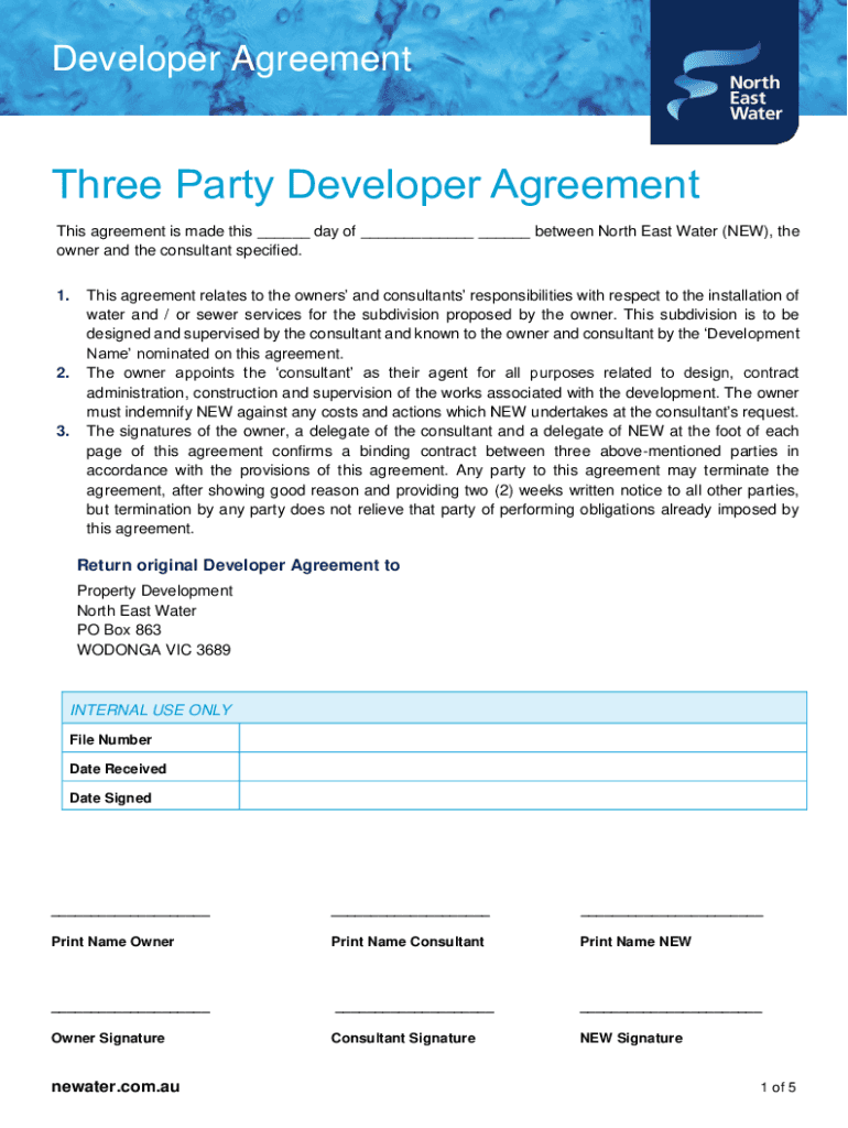 Developer AgreementThree Party Developer Agreement This agreement is made this ___ day of ___ ___ between North East Water (NEW), the owner and the consultant specified. 1.2.3. This agreement relates