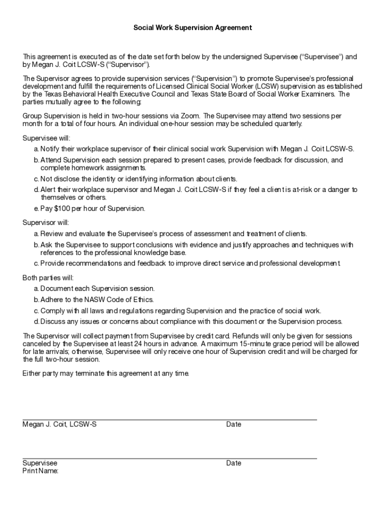 Social Work Supervision Agreements agreement is executed as of the date set forth below by the undersigned Supervised (Supervised) and by Megan J. Cost LCSW (Supervisor). The Supervisor agrees to