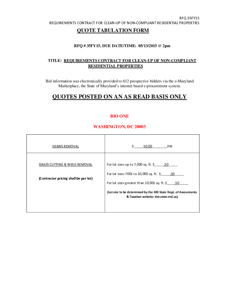 RFQ 35FY15 REQUIREMENTS CONTRACT FOR CLEANUP OF NONCOMPLIANT RESIDENTIAL PROPERTIESQUOTE TABULATION FORM RFQ # 35FY15, DUE DATE/TIME: 05/13/2015 @ 2pmTITLE: REQUIREMENTS CONTRACT FOR CLEANUP OF NONCOMPLIANT