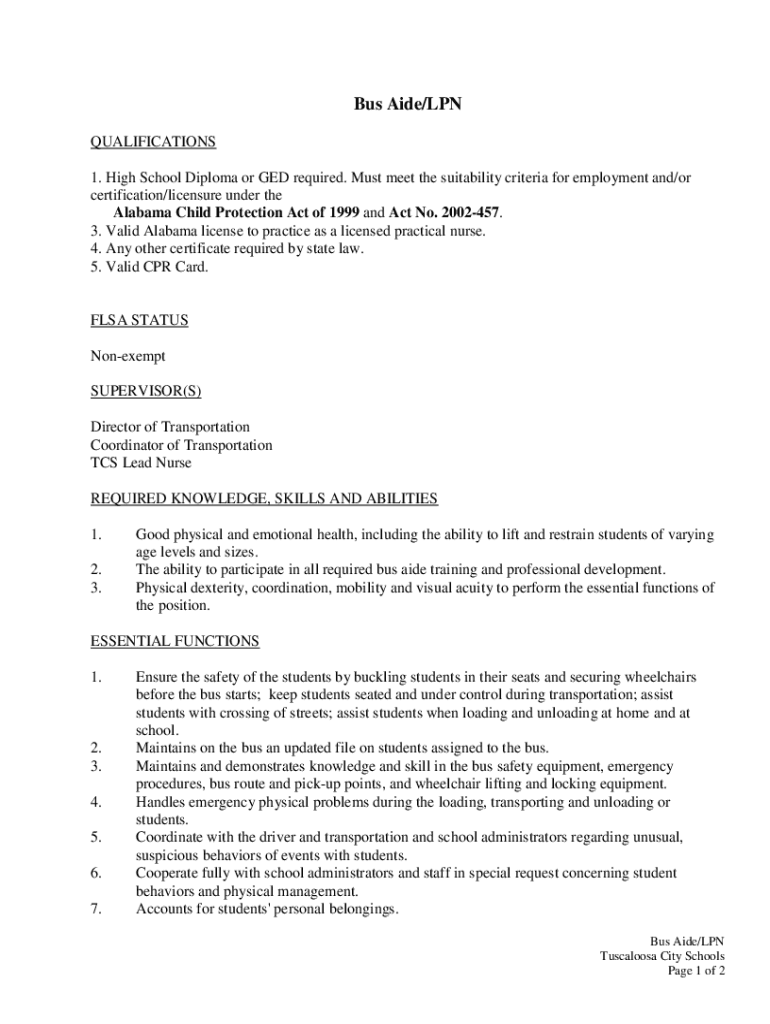Bus Aide/LPN QUALIFICATIONS 1. High School Diploma or GED required. Must meet the suitability criteria for employment and/or certification/licensure under the Alabama Child Protection Act of 1999