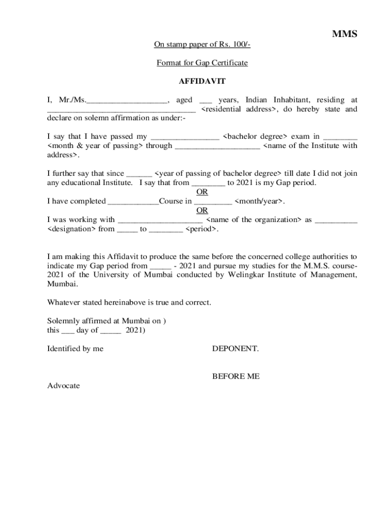 MMS On stamp paper of Rs. 100/Format for Gap Certificate AFFIDAVIT I, Mr./Ms.___, aged ___ years, Indian Inhabitant, residing at ___ residential address, do hereby state and declare on solemn affirmation