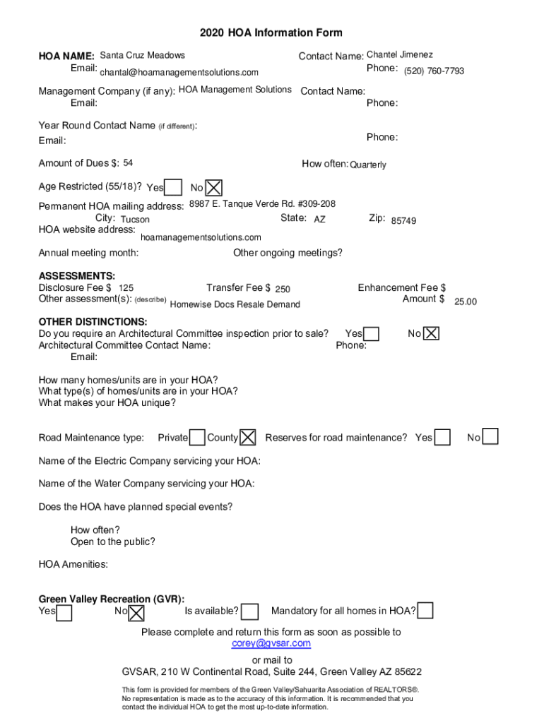 2020 2015 HOA Information Form Contact Name: Channel Jimenez Phone: (520) 7607793HOA NAME: Santa Cruz Meadows Email: chantal@hoamanagementsolutions.comManagement Company (if any): HOA Management Solutions