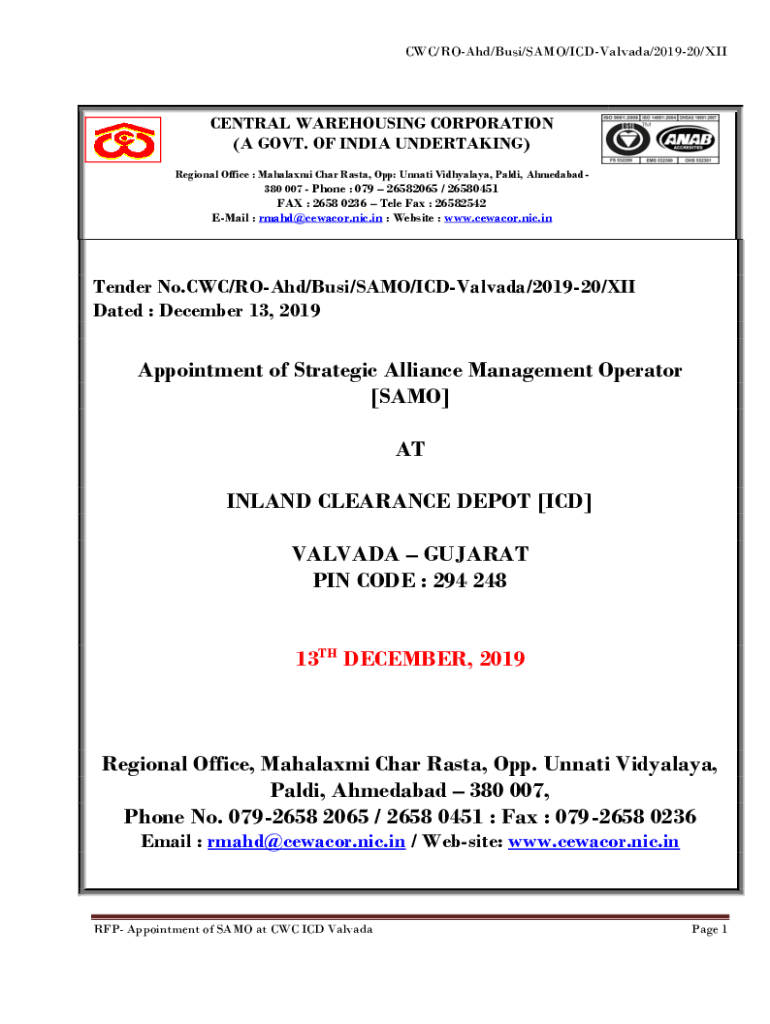 CWC/Road/Bus/SAME/ICDValvada/201920/CENTRAL WAREHOUSING CORPORATION (A GOVT. OF INDIA UNDERTAKING) Regional Office : Thalami Char Rasta, Opp: Innate Vidhyalaya, Aldi, Ahmedabad380 007 Phones : 079