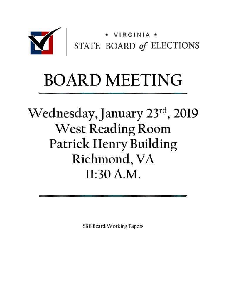 BOARD MEETING Wednesday, January 23rd, 2019 West Reading Room Patrick Henry Building Richmond, VA 11:30 A.M.BE Board Working Superstate BOARD OF ELECTIONS AGENDA DATE: Wednesday, January 23, 2019,