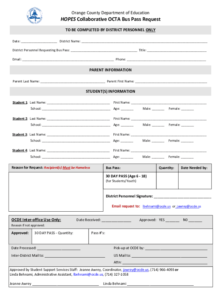 Orange County Department of EducationHOPES Collaborative OCTA Bus Pass Request TO BE COMPLETED BY DISTRICT PERSONNEL ONLY Date: ___ District Name: ___ District Personnel Requesting Bus Pass: ___ Title: