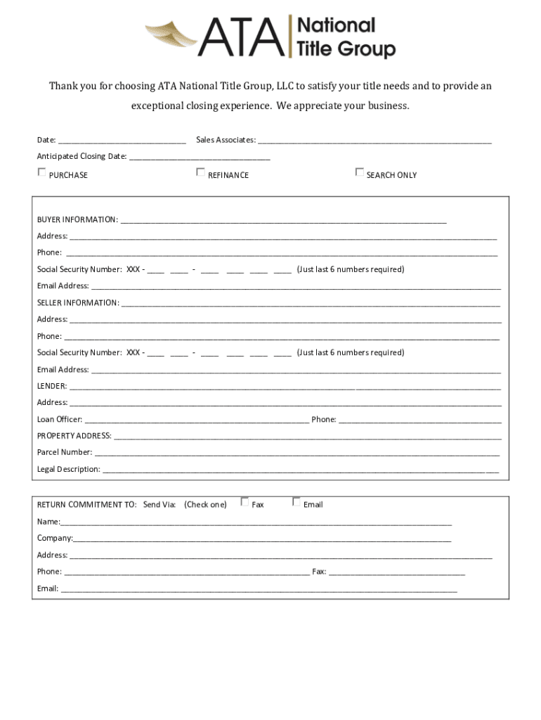 Thank you for choosing ATA National Title Group, LLC to satisfy your title needs and to provide an exceptional closing experience. We appreciate your business. Date: ___Sales Associates: ___Anticipated
