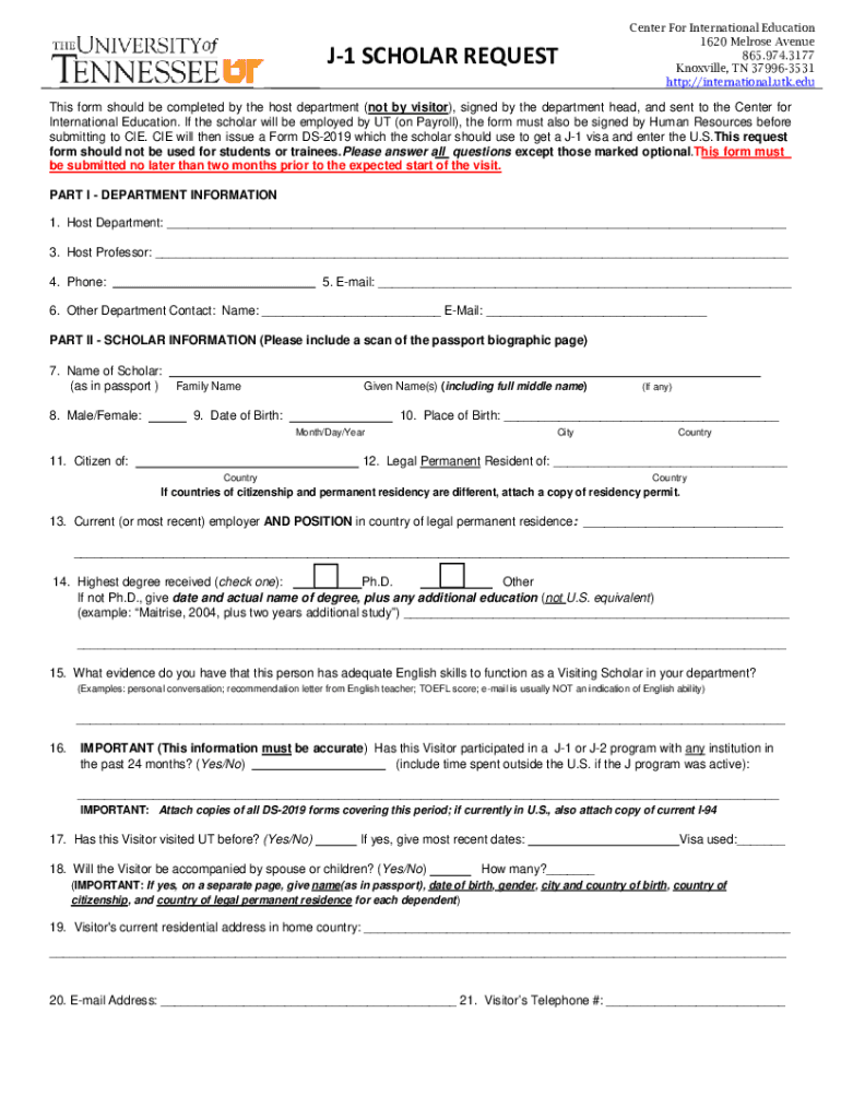 J1 SCHOLAR REQUESTCenter For International Education 1620 Melrose Avenue 865.974.3177 Knoxville, TN 379963531 http://international.utk.eduThis form should be completed by the host department (not