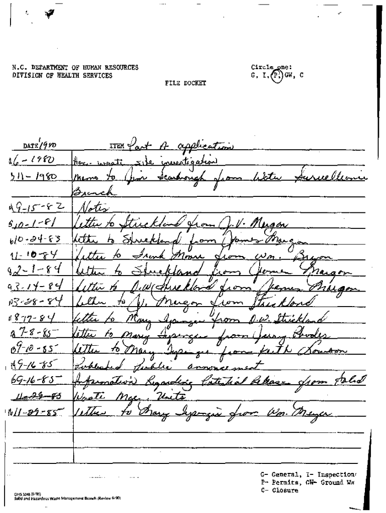 , ;. N.C. Del\'ART MEN\'X OF HUMAN RESOURCES DIVISION OF HEALTH SERVICESCircle: I, GW, G, FILE DOCKET(DATE\'DDS 3348 (6/8S)Solid and Humorous Wall counsel\'l\'tent Branch (Review 6/90)G General, I