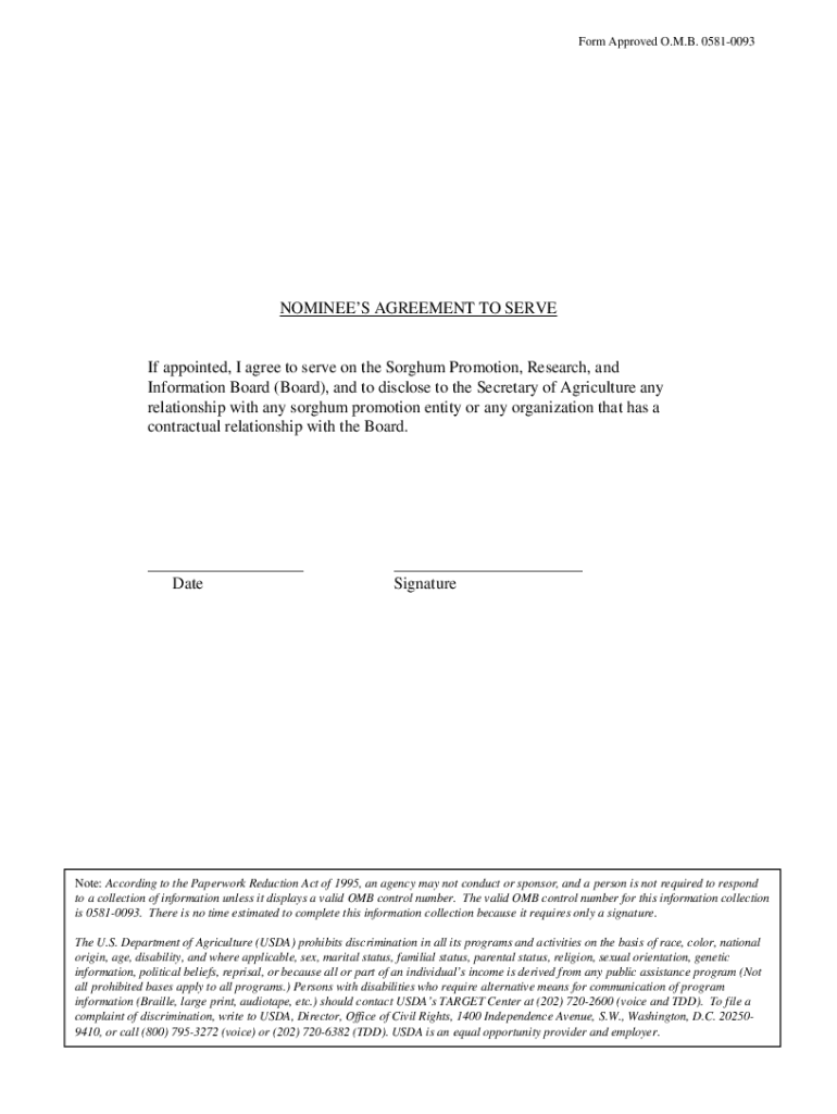Form Approved O.M.B. 05810093NOMINEES AGREEMENT TO Served appointed, I agree to serve on the Sorghum Promotion, Research, and Information Board (Board), and to disclose to the Secretary of Agriculture