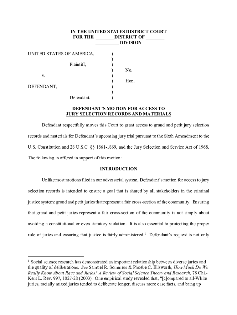 IN THE UNITED STATES DISTRICT COURT FOR THE ___DISTRICT OF ___ ___ DIVISION UNITED STATES OF AMERICA, Plaintiff, v. DEFENDANT, Defendant.) ))))))))No. Hon.DEFENDANTS MOTION FOR ACCESS TO JURY SELECTION