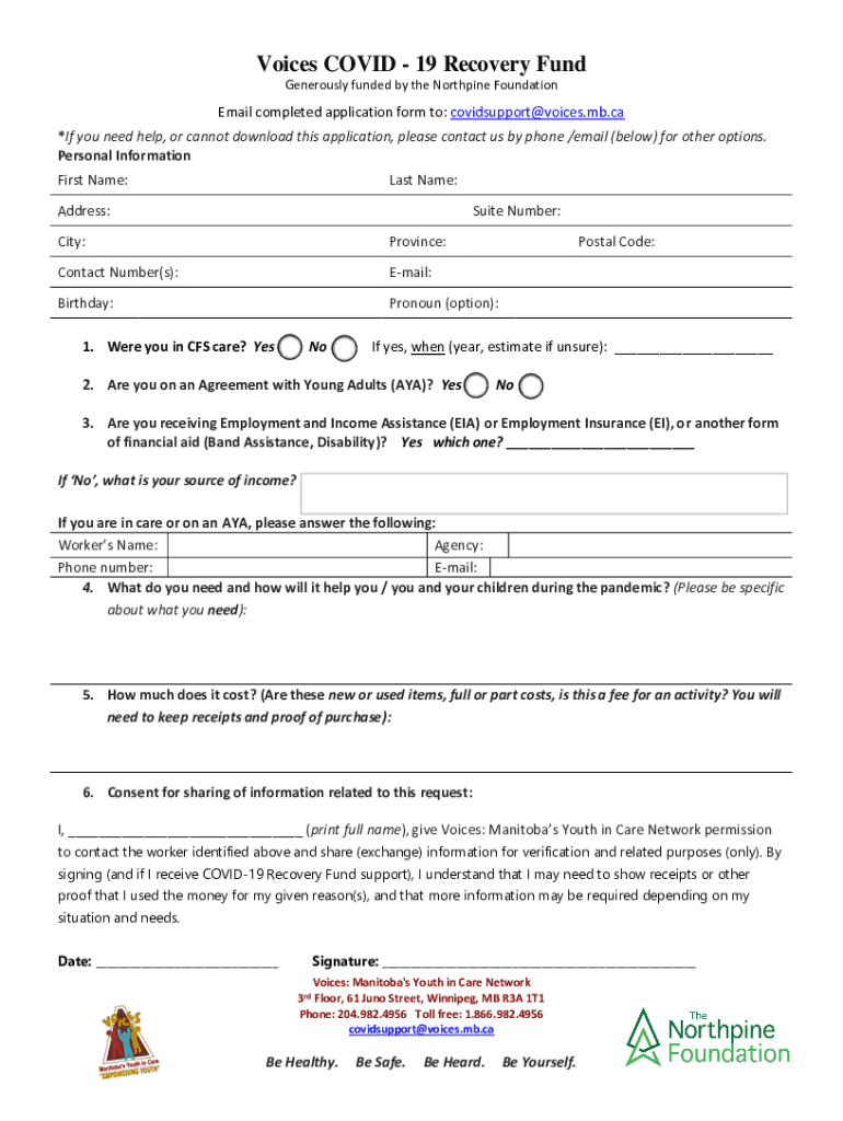 Voices COVID-19 Recovery Fund Generously funded by the North pine Foundational completed application form to: covidsupport@voices.mb.ca *If you need help, or cannot download this application, please