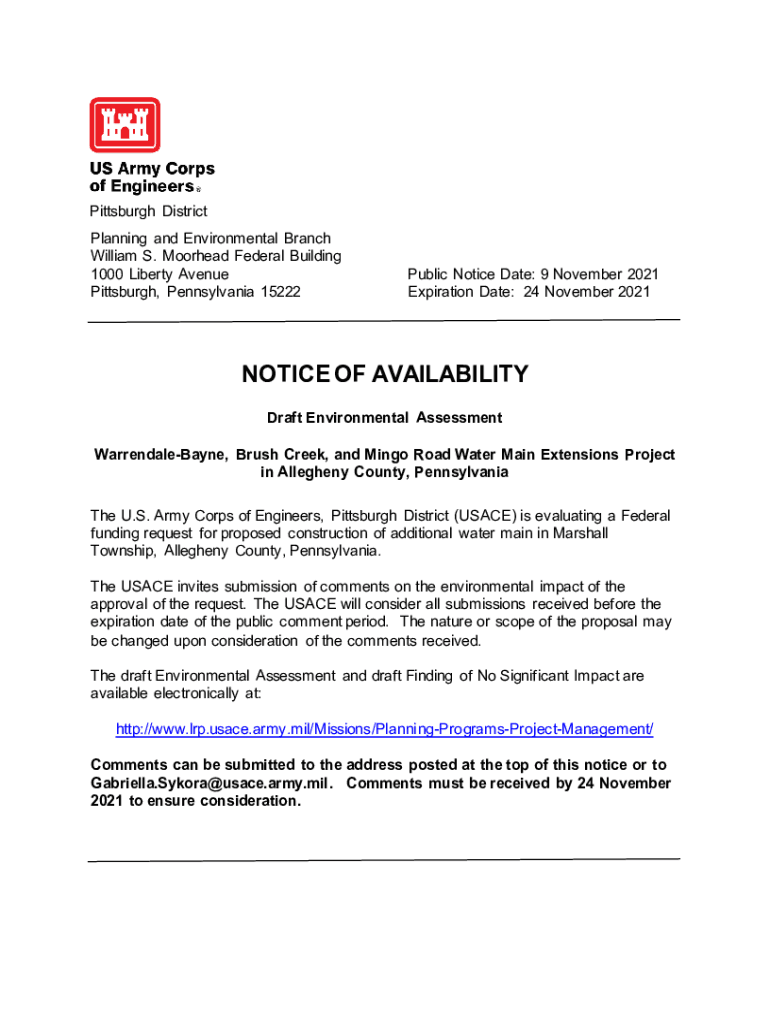 Pittsburgh District Planning and Environmental Branch William S. Muirhead Federal Building 1000 Liberty Avenue Pittsburgh, Pennsylvania 15222Public Notice Date: 9 November 2021 Expiration Date: 24