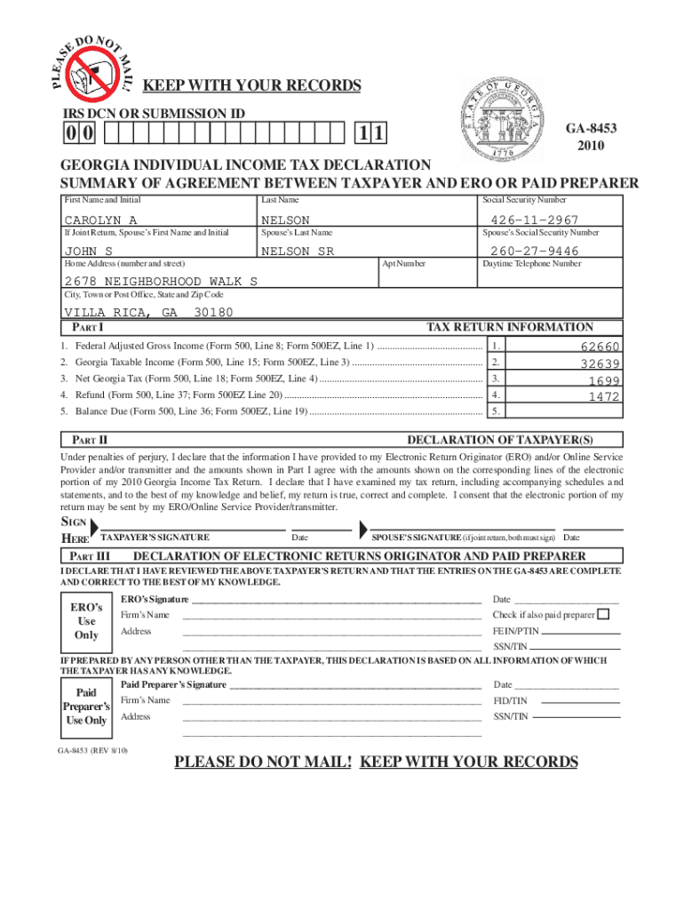 DO HOTMAIL!PLEASEKEEP WITH YOUR RECORDS IRS DCN OR SUBMISSION ID00GA8453 201011GEORGIA INDIVIDUAL INCOME TAX DECLARATION SUMMARY OF AGREEMENT BETWEEN TAXPAYER AND ERO OR PAID PREPARER First Name and