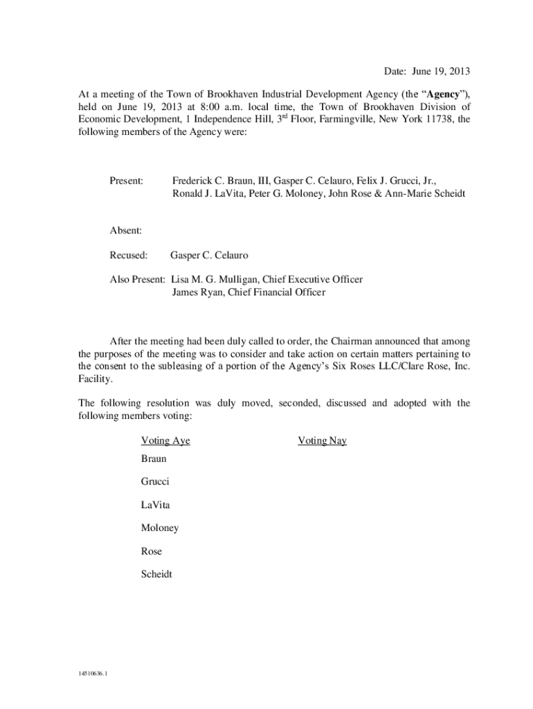 Date: June 19, 2013, At a meeting of the Town of Brookhaven Industrial Development Agency (the Agency), held on June 19, 2013, at 8:00 a.m. local time, the Town of Brookhaven Division of Economic