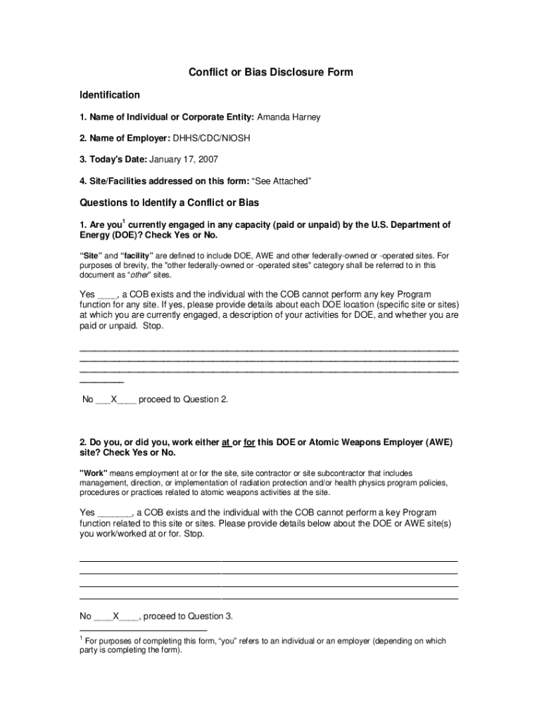 Conflict or Bias Disclosure Form Identification 1. Name of Individual or Corporate Entity: Amanda Harvey 2. Name of Employer: HHS/CDC/NOSH 3. Today\'s Date: January 17, 2007 4. Site/Facilities addressed