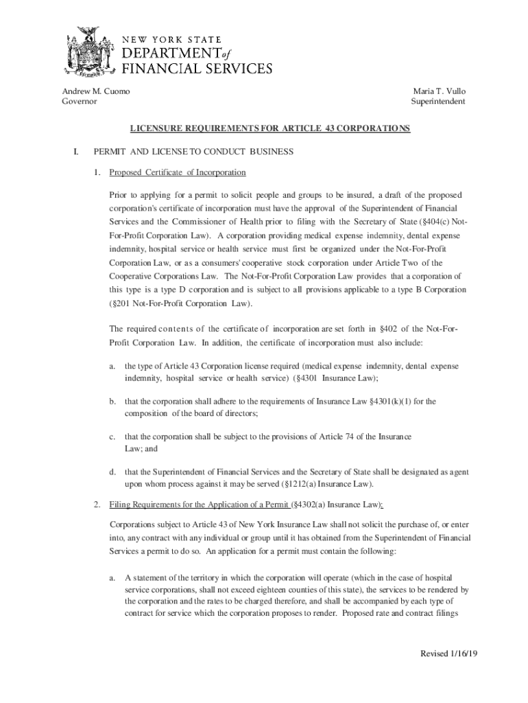2Andrew M. Cuomo Governor Maria T. Full SuperintendentLICENSURE REQUIREMENTS FOR ARTICLE 43 CORPORATIONS I.PERMIT AND LICENSE TO CONDUCT BUSINESS 1. Proposed Certificate of Incorporation Prior to