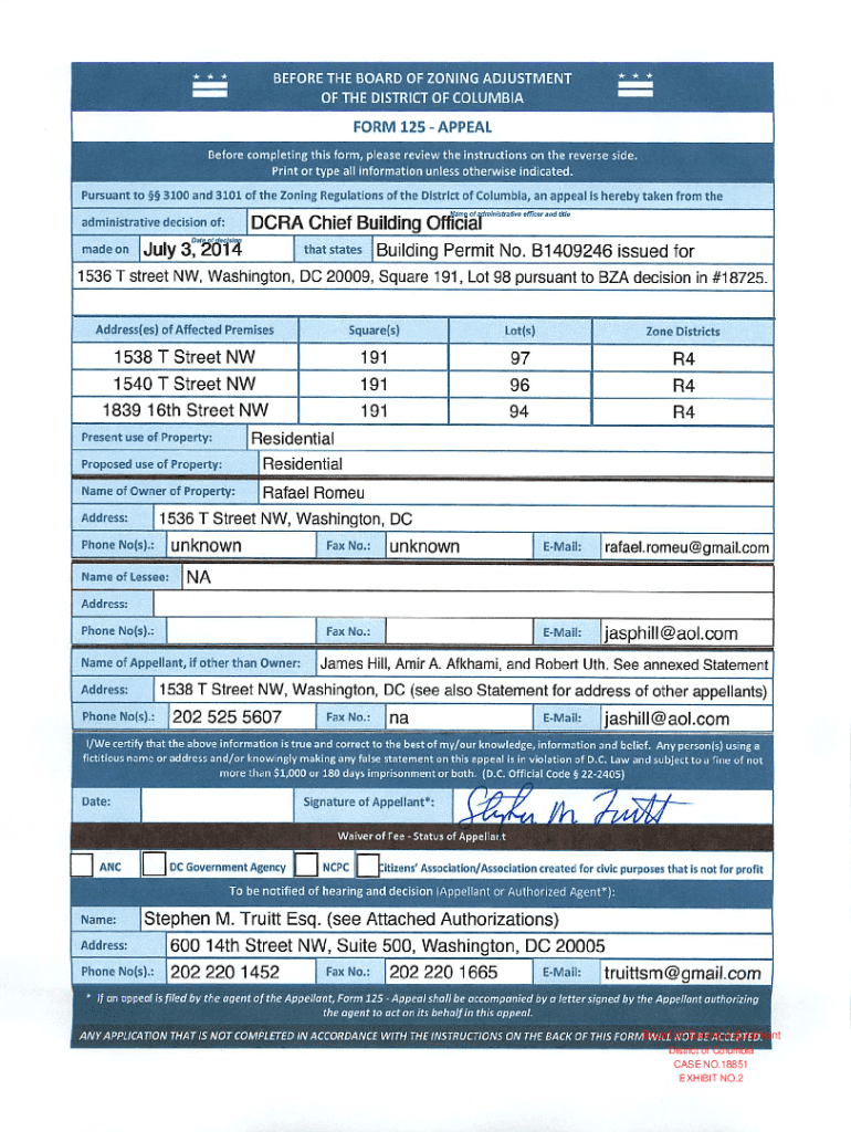 BEFORE THE BOARD OF ZONING ADJUSTMENT OF THE DISTRICT OF COLUMBIA FORM 125 APPEAL Before completing this form, please review the instructions on the reverse side. Pursuant to 3100 and 3101 of the