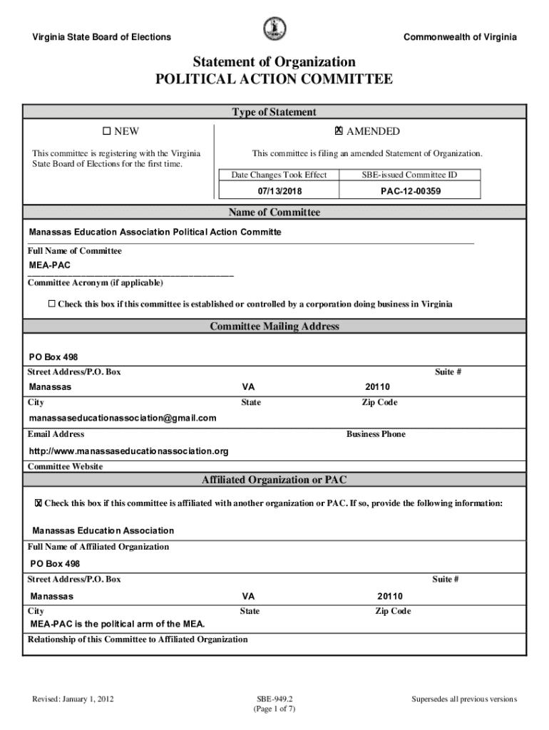 Virginia State Board of Elections Commonwealth of VirginiaStatement of Organization POLITICAL ACTION COMMITTEE Type of Statement NEW AMENDED This committee is registering with the Virginia State Board